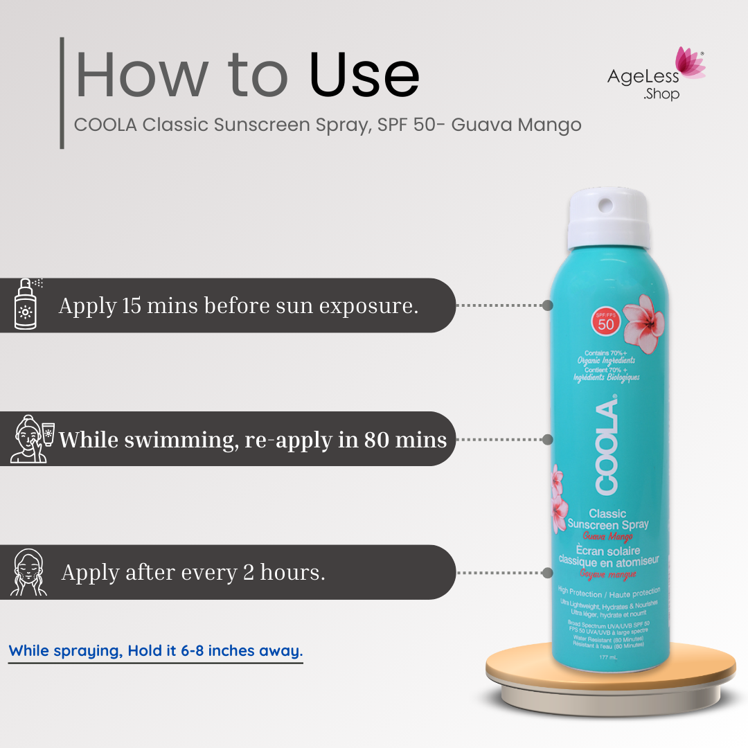 COOLA Classic Sunscreen Spray, SPF 50 - Guava Mango, is a tropical escape in a bottle, delivering broad-spectrum UVA/UVB protection with a delightful natural scent. This award-winning sunscreen goes beyond sun defense, incorporating the Farm to Face philosophy and an ultra-sheer formula enriched with the antioxidant-rich Plant Protection complex. Designed for both active days in the sun and daily use, the Guava Mango variant adds a sensory experience to sun protection, making it a versatile and enjoyable choice for all occasions.
