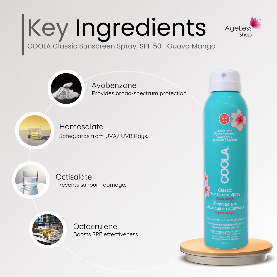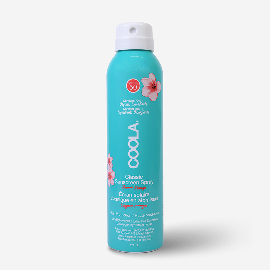 COOLA Classic Sunscreen Spray, SPF 50 - Guava Mango, offers a tropical twist to sun protection with a refreshingly natural scent, featuring an ultra-sheer, organic formula for water-resistant broad-spectrum UVA/UVB protection.