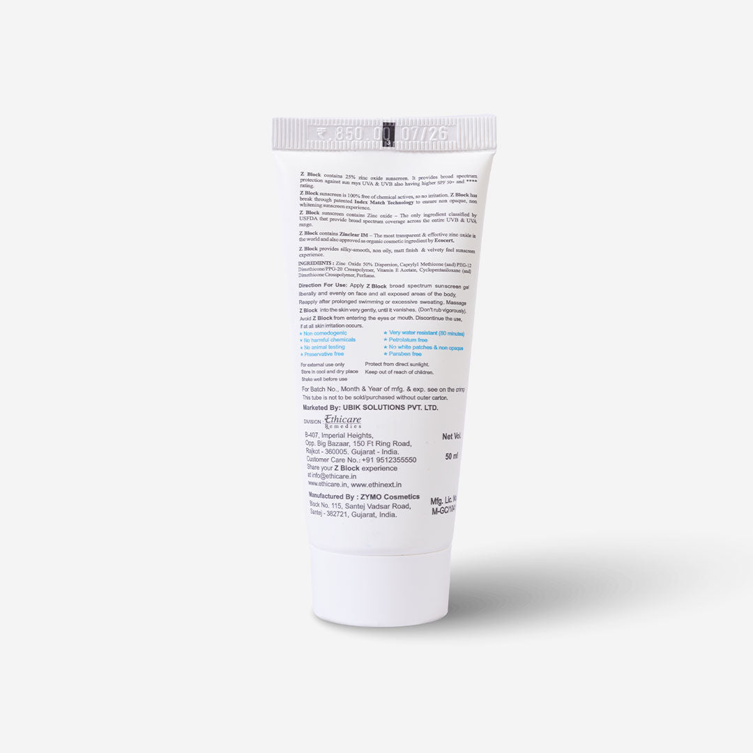 Liberally and evenly apply Z-Block broad-spectrum sunscreen gel on the face and all exposed body areas before sun exposure. Gently massage into the skin until absorbed. Avoid eye and mouth contact.